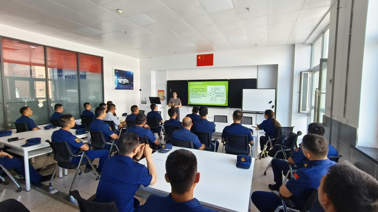 双带头人党支部书记崔丹丹针对将新能源汽车的“三电系统”与传统燃油车的“发动机+油路”结构差异进行展示,结合新能源汽车火灾“隐蔽性强、蔓延快、复燃风险高”三大特点,讲解“安全防护、高压系统断电”等新能源汽车火灾救援关键要点,帮助消防救援队员掌握新能源汽车结构原理。