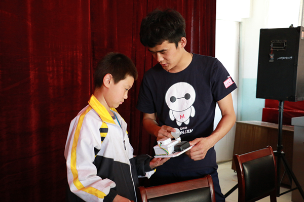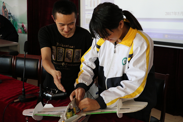 来自新疆交通职业技术学院机电D151班的马龙用生动而又形象的语言与同学们一起分享了自制的航天模型,分享了自己进学院社团的收获,用通俗易懂的语言给同学们讲解了四轴飞行器、苏-27模型机等专业知识,用自己亲身经历给孩子们讲述了兴趣爱好与专业知识密不可分,相辅相成成就一条创新路的感悟,他告诉中学生们要用专业知识为兴趣爱好开辟道路,通过专业知识学习解决实践上的实际问题和技术设计,达到学以致用。