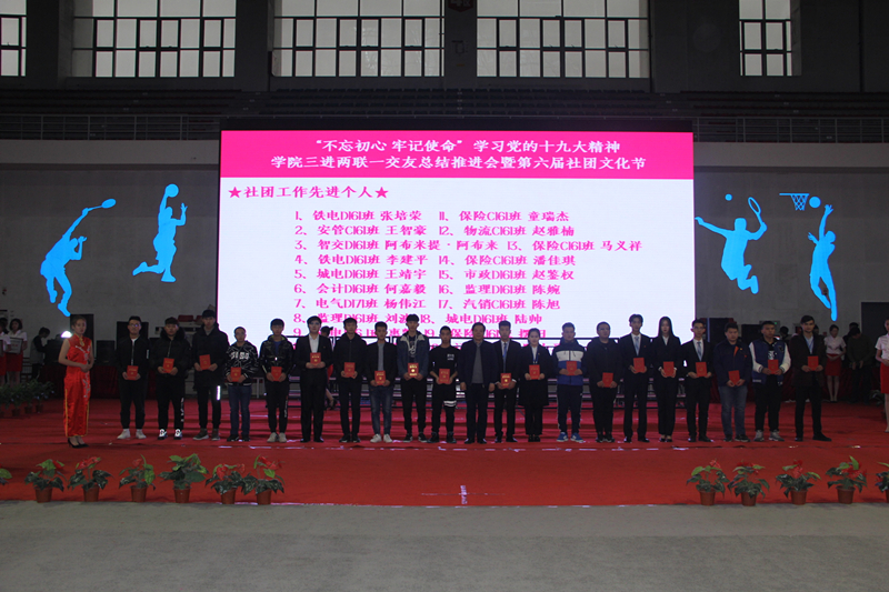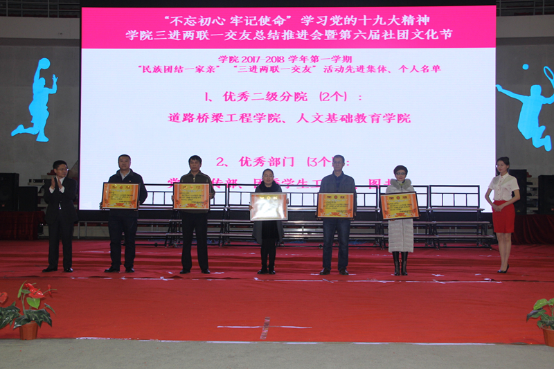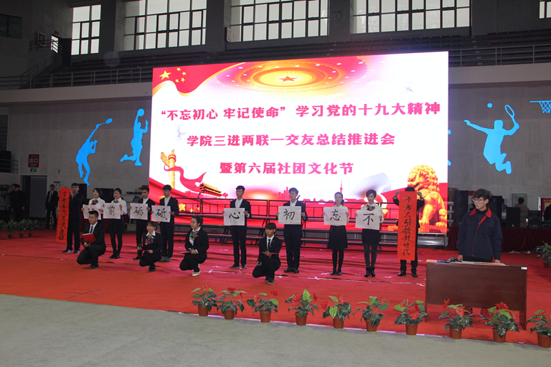 为深入贯彻落实学习党的十九大精神,深化2017年度学院“民族团结一家亲”“三进两联一交友”工作,促进校园文化建设,“不忘初心·牢记使命”学习党的十九大精神学院三进两联一交友总结推进会暨“青春践行十九大·你我共筑社团梦”第六届社团文化节闭幕式于12月13日在学院文体中心成功举办。