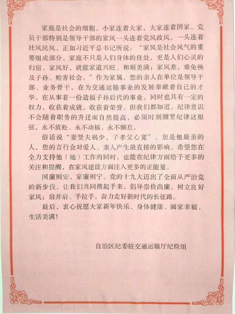 紧绷纪律弦 廉洁过春节--致交通运输厅系统党员领导干部及亲属的一封信