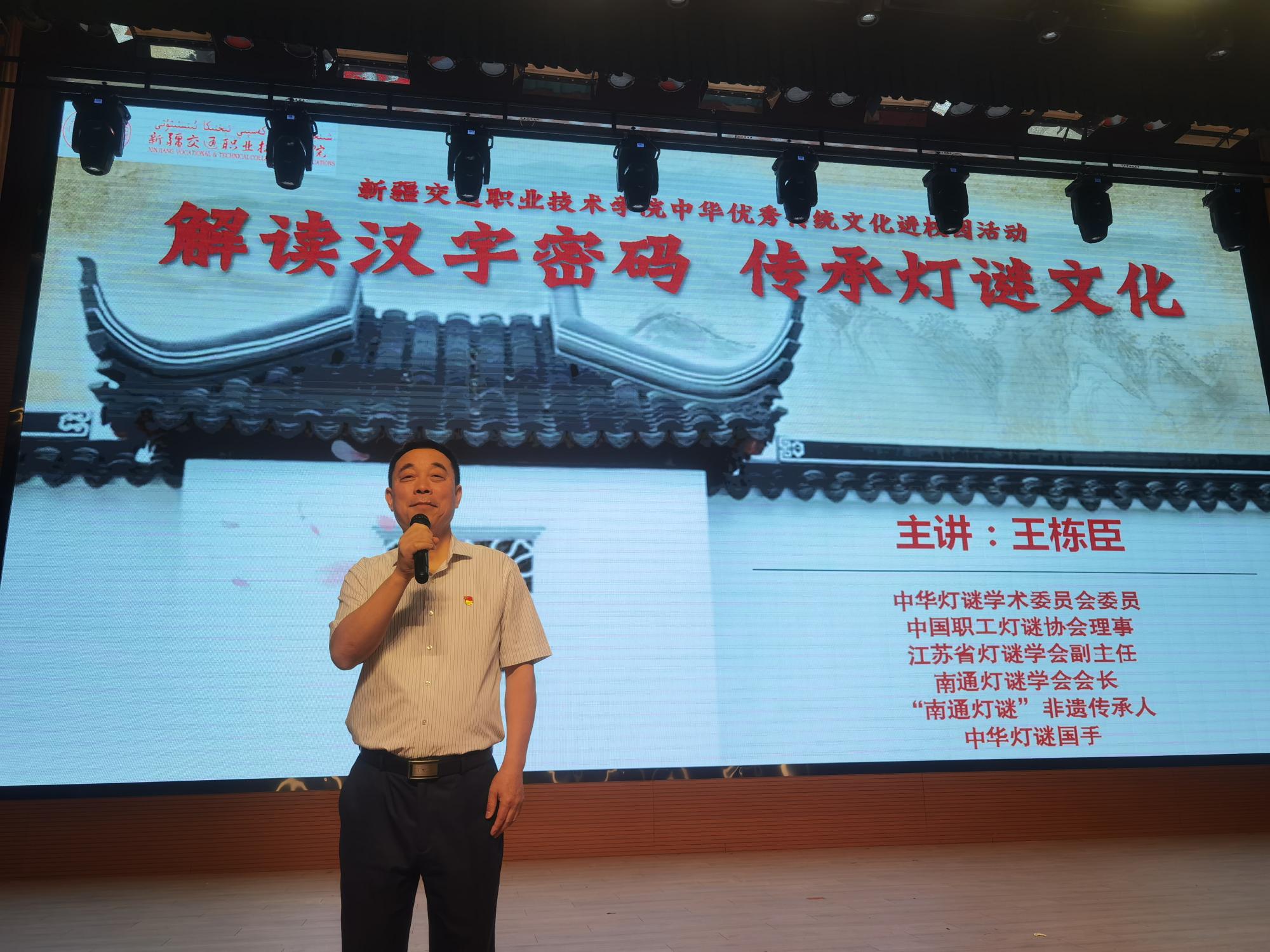 王栋臣老师是来自江苏航运职业技术学院的一名援疆干部,也是“南通灯谜”非物质文化遗产代表性传承人,业余担任中华灯谜学术委员会委员、中国职工灯谜协会理事、江苏省灯谜学会副主任、南通灯谜学会会长等职务,先后策划组织了数十场大型灯谜活动,曾经获得灯谜猜射、创作、论文等近百项奖项。