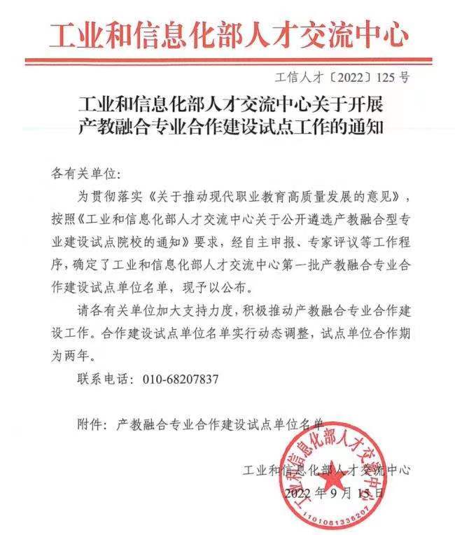 9月15日,工业和信息化部人才交流中心发布工信人才【2022】125号文《关于开展产教融合专业合作建设试点工作的通知》,文件公布了国家级第一批产教融合专业合作建设的试点单位及专业,我院新能源汽车检测与维修技术和智能交通技术两个专业成功入选。