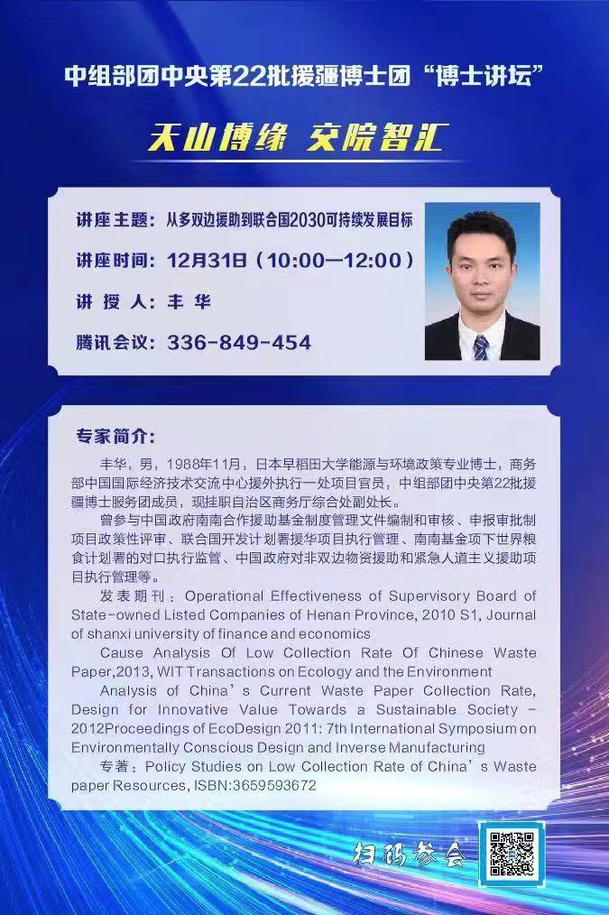 为深入学习贯彻党的二十大报告关于“中国始终坚持维护世界和平、促进共同发展的外交政策宗旨,致力于推动构建人类命运共同体”的要求,深刻领会和践行习近平总书记提出“构建人类命运共同体和新型国际关系”的重大倡议,12月31日上午,第22批援疆博士团丰华博士以“从多双边援助到联合国可持续发展目标”为题,为学院230余名师生代表带来了一场精彩的学术大餐。