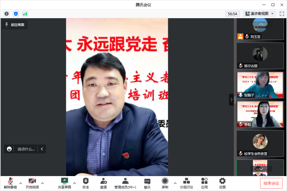 举办“青马论道•朋辈论坛”“学习二十大 青马学员说”专题分享会,邀请到了昌吉学院、江苏海事职业技术学院团学骨干云端相聚,共话成长