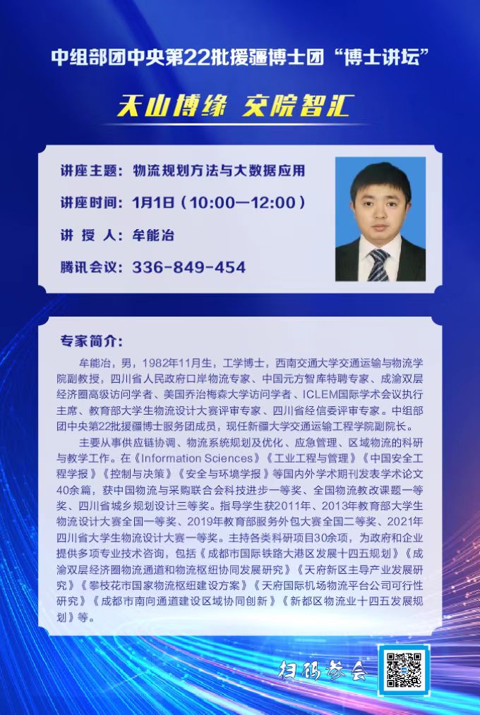 为全面贯彻落实习近平总书记关于加快建设交通强国的重要论述精神,推动交通物流融合发展,做好新疆现代流通领域人才培养工作,1月1日上午,“天山博缘 交院智汇”中组部团中央第22批援疆博士团成员牟能冶与交院师生相聚“云”端,为大家带来一场精彩讲座。