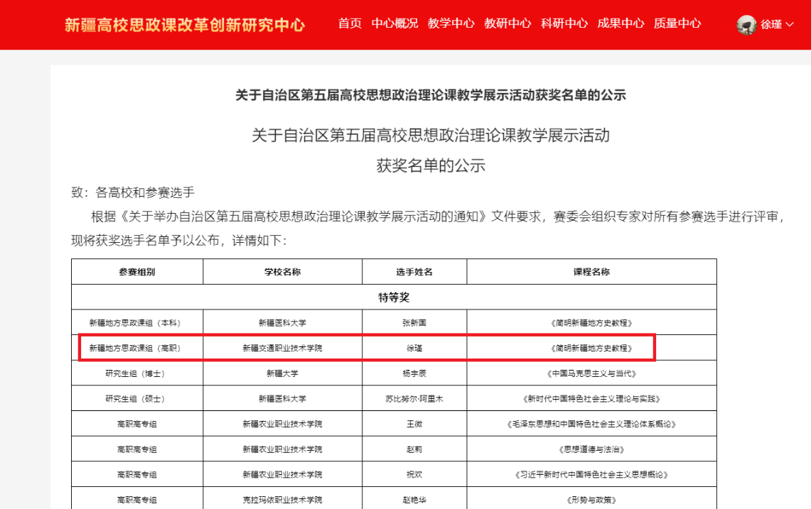 本次比赛共有来自47所高校、213名教师参加,分为研究生组、本科组、高职高专组和新疆地方思政课组。学院参赛教师用自己积极向上、刻苦钻研的钉钉子精神融入课程中,展示出对课程的精准把握、内容的精心选取、学情的精确剖析、教学方法的精妙创新,通过层层角逐徐瑾老师获得《简明新疆地方史教程》课程特等奖、赫湘红老师获得《习近平新时代中国特色社会主义思想概论》课程优秀奖、程筠婷老师获得《思想道德与法治》课程优秀奖。