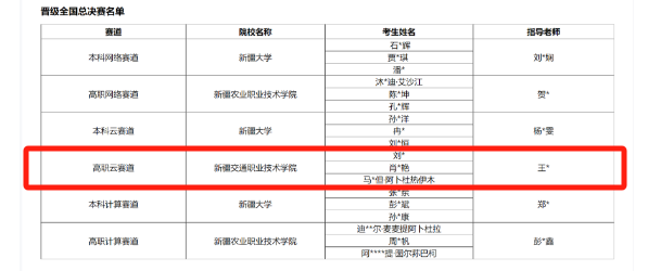 12月20日,华为ICT大赛2023-2024中国区新疆维吾尔自治区实践赛决赛结果公布,人工智能工程学院数据D231班刘倩,数据D222班肖双艳、数据D222班马尔但·阿卜杜热伊木在华为ICT大赛中以高职组云赛道第一名成绩晋级全国总决赛。