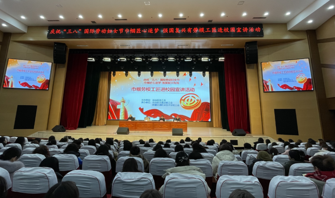 3月4日,由自治区总工会主办的“巾帼匠心逐梦 强国复兴有我——巾帼劳模工匠进校园”宣讲活动在新疆交通职业技术学院举行。活动旨在发挥巾帼劳模的榜样示范作用,用初心使命感召师生,用奋斗经历感动师生,用先进事迹感染师生,大力弘扬劳模精神、劳动精神、工匠精神。
