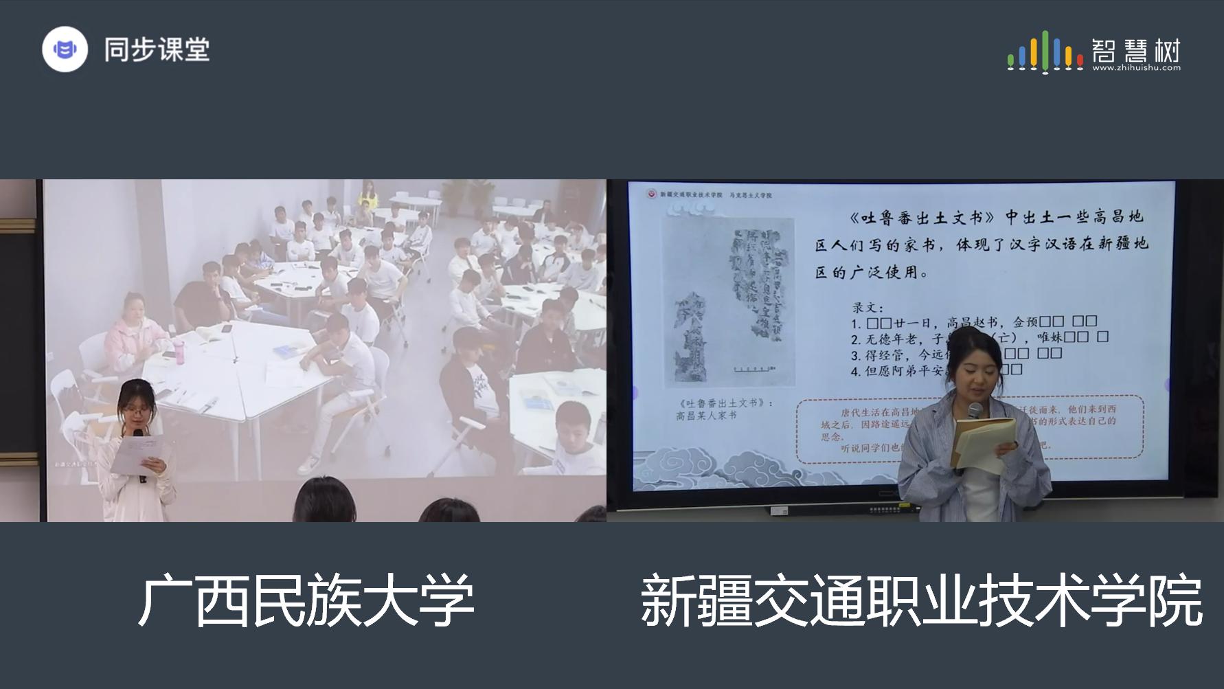 在智慧树平台的支持下,同步课堂分为两部分进行。广西民族大学郭亮老师为学生们讲述了民族问题的概念范畴与内涵特征,他从民族问题产生的根源讲到现实影响,从中国现实讲到世界大势,内容丰富、讲解生动。随后由新疆交通职业技术学院吴冰寒老师讲授,她从历史的角度,通过一个家族的发展变迁,展现了中华民族交往交流交融的过程,与郭亮老师的理论阐释形成共鸣。整节课气氛活跃,两校学生参与积极性高。