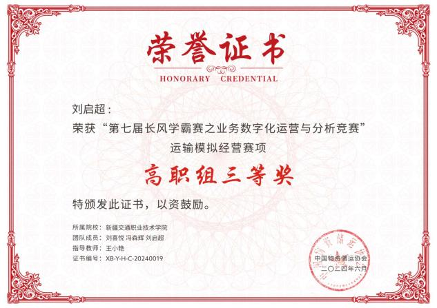 获奖选手阿合别尔激动地说:“很感谢学院给我们提供这样的平台,感谢王小艳老师全身心的带我们训练备赛,团队小伙伴也相互鼓励,一起努力拼搏。比赛中,我们通力合作,合理开拓市场,控制成本使得运营收益最大化,体现了我们现代物流、供应链领域的数字技能和专业实操能力。今后,我会更加努力学习,不断提升综合水平,为新疆现代物流业尽一份自己的力量!”