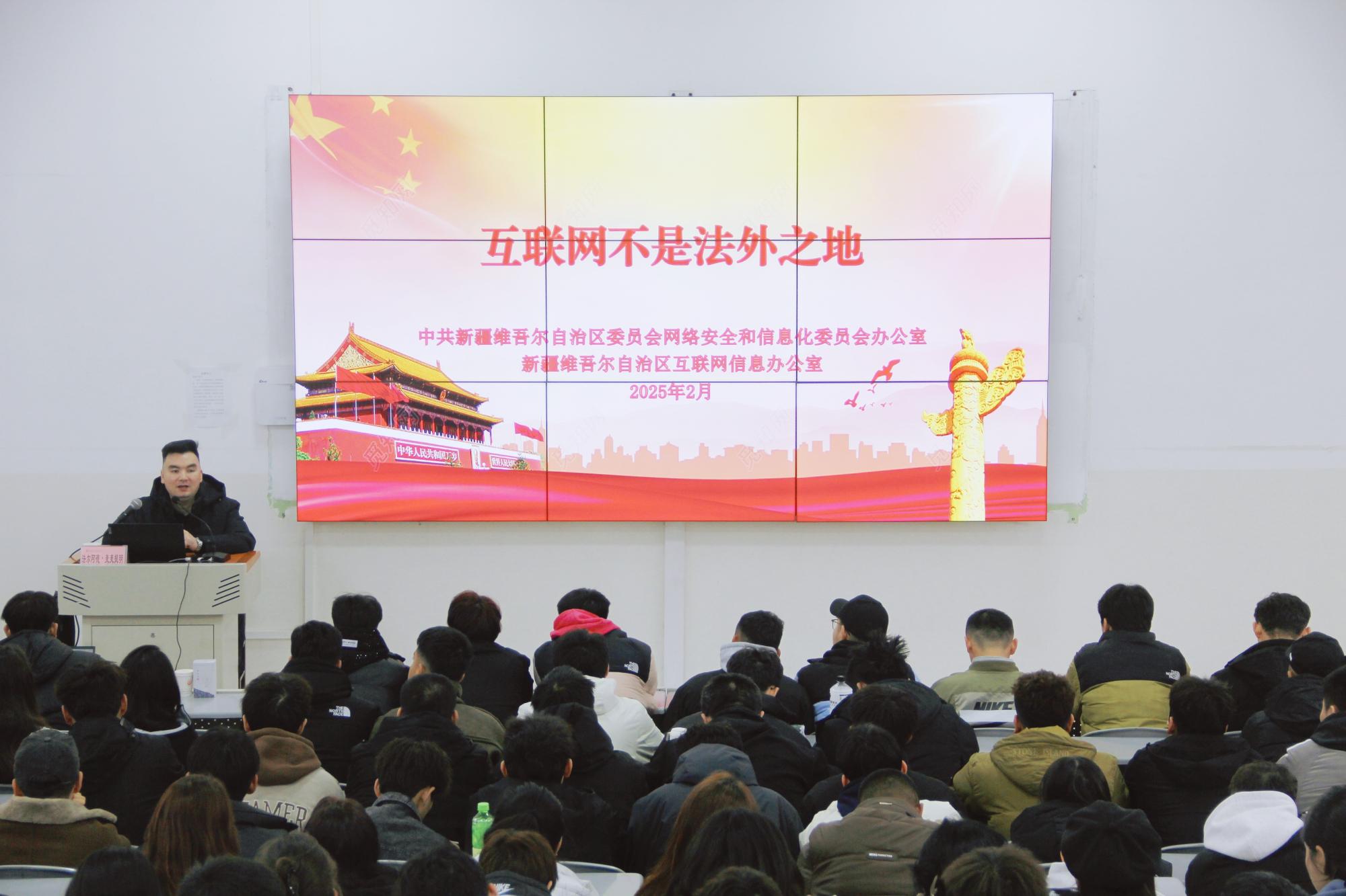 随着互联网的快速发展,网络空间已成为意识形态斗争的主阵地。为进一步增强学生的网络安全意识,学院邀请自治区网信办法尔阿德•麦麦提明同志以《互联网不是法外之地》为题,为同学们带来了一场生动精彩的讲座。法尔阿德同志结合近年来校园发生的典型案例,深入浅出地讲解了网络安全法律法规、网络谣言识别、个人信息保护等方面的知识,引导同学们文明上网、理性表达,共同营造清朗的网络空间。