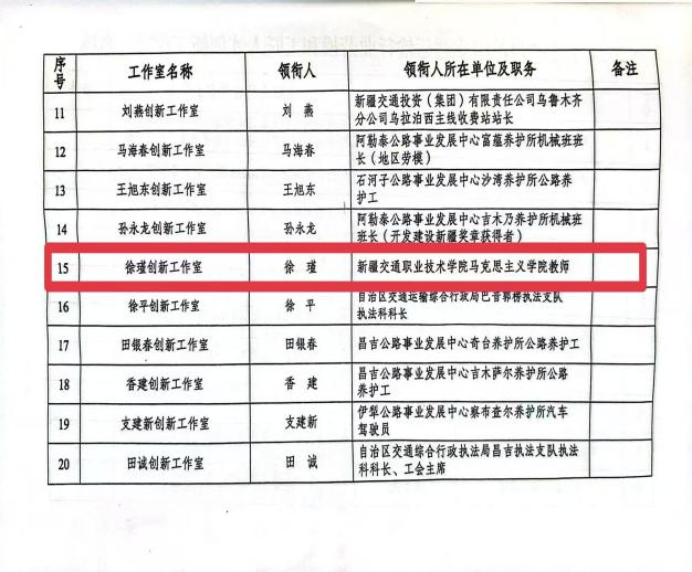 近日,自治区交通运输厅发布《关于命名一批2024年自治区交通运输行业劳模和工匠人才创新工作室的通报》,经层层申报、综合评审,学院马克思主义学院徐瑾创新工作室成功入选,被命名为2024年“自治区交通运输行业劳模和工匠人才创新工作室”。