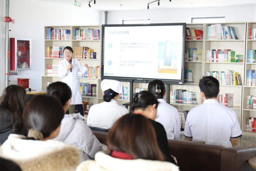 本次活动特邀乌鲁木齐市妇幼保健院医护团队授课。高玉梅医生将古老的《黄帝内经》智慧与大学教师的职业特点相结合,针对长期伏案、久站讲课、精神压力大等职业“耗损”,带来了一场实用又接地气的中医调护课。讲座结束后,现场瞬间变成了温馨的“问诊台”:中医诊脉、乳腺检查、走罐推拿、耳穴针灸……医生们专业周到的服务,让老师们在忙碌的工作间隙,享受了一次身心的“舒缓解压”。
