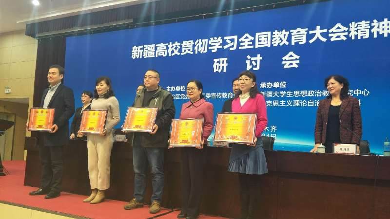 近期,为深入学习贯彻习近平新时代中国特色社会主义思想和全国教育大会精神,总结改革40年来高校思想政治教育工作取得的成就,自治区大学生思想政治教育研究中心面向全区高校思想政治教育工作者征集了124篇理论研究论文。经过论文重复率检测35%以内、专家政治审读、匿名函评和会评等环节,评出一等奖12篇;二等奖16篇;三等奖20篇;优秀奖34篇;优秀组织奖5个。其中马克思主义学院喜获二等奖1篇;三等奖6篇;优秀奖6篇,共获奖13篇,同时取得优秀组织奖。11月24日,我院获奖教师在新疆师范大学参加表彰大会。