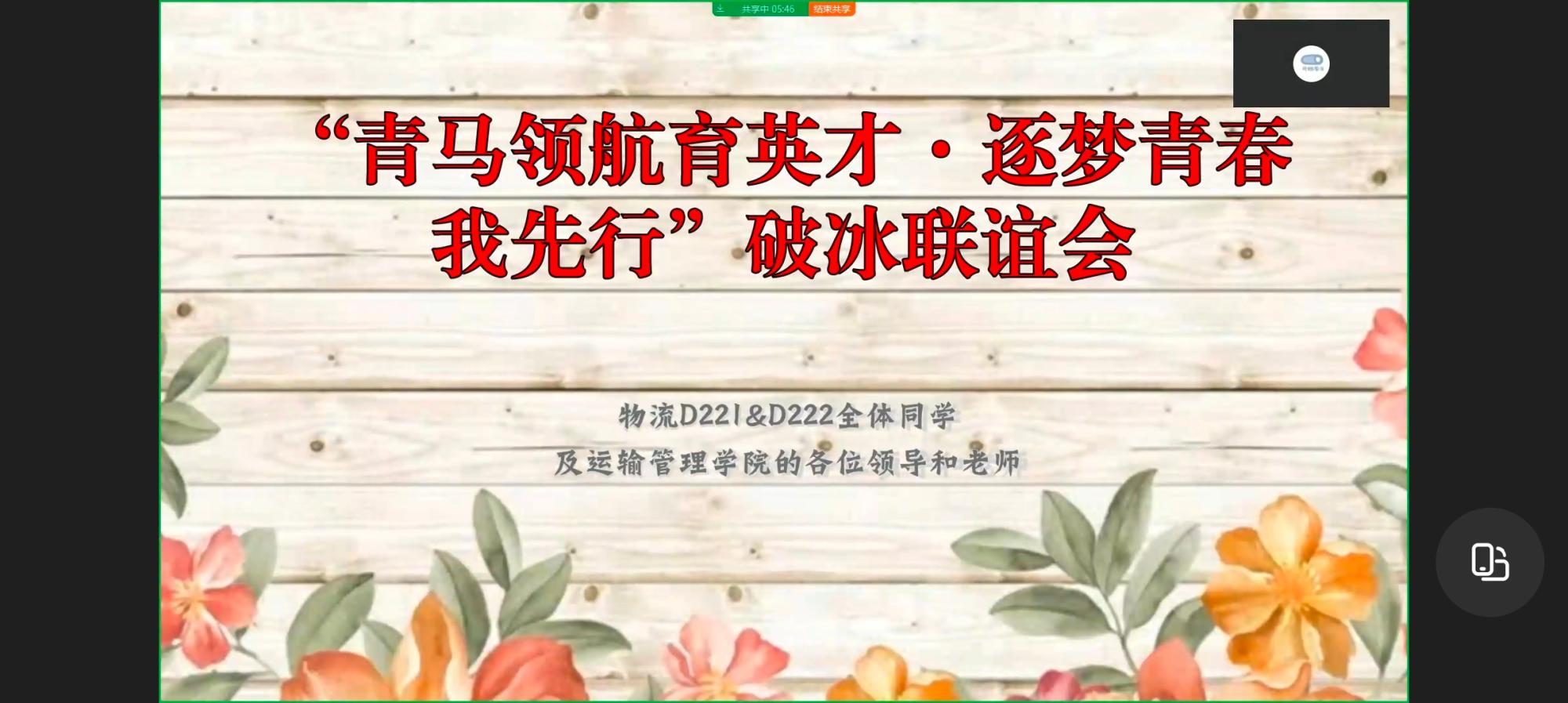 为增进同学们之间友谊,增强班级的凝聚力和向心力,培养团队合作意识,11月6日晚,运输管理学院物流D221班和物流D222在班主任刘方瑞轩老师的指导下,通过钉钉视频会议形式开展“青马领航育英才·逐梦青春我先行”破冰联谊会。物流D221、物流D222全体同学及分院相关老师共92人参加活动。
