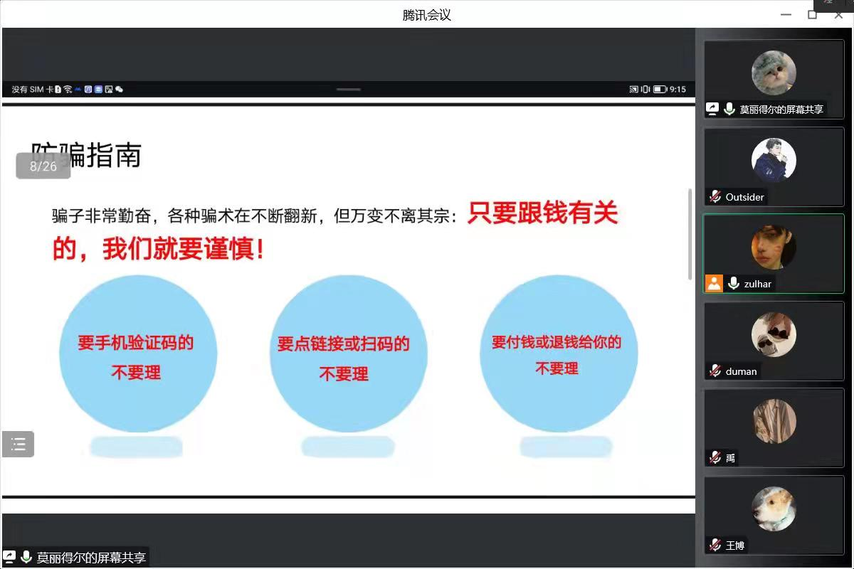 为切实增强师生反诈防骗意识,提升师生安全防范意识和安全防护能力,营造和谐平安的校园环境,11月9日-10日,道路桥梁工程学院20级、21级、22级全体班级采用线上主题班会形式开展“反诈防骗,你我同行”主题活动—网上抽奖、双十一购物骗局识别课堂。