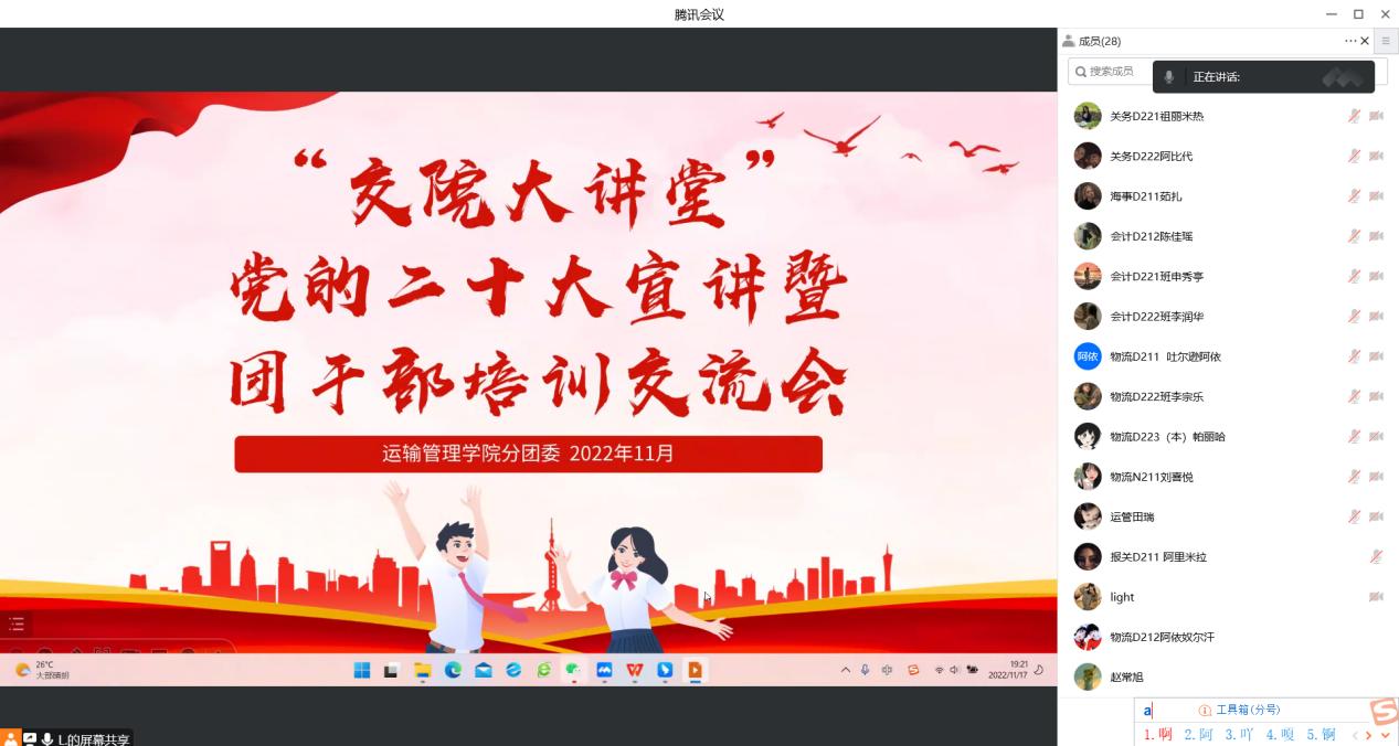 为深入学习宣传贯彻党的二十大精神,11月17日下午,运输管理学院分团委开展“交院大讲堂”党的二十大宣讲暨团干部培训交流会,就“如何开展团支部的建设”主题展开热烈讨论。