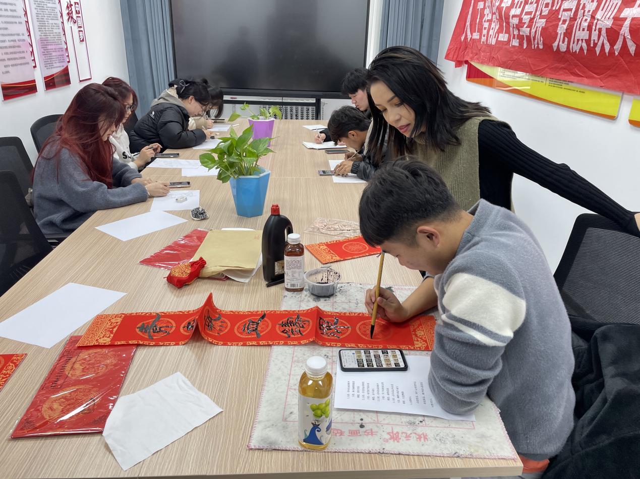 活动现场,墨香飘溢,气氛热烈,学生们积极踊跃参与,借此感受优秀传统文化的精髓。同学们现场写对联、书法、绘画等,压纸、蘸墨、起笔、收笔,一起一落之间,将美好的祝愿化作一幅幅寓意吉祥的对联。