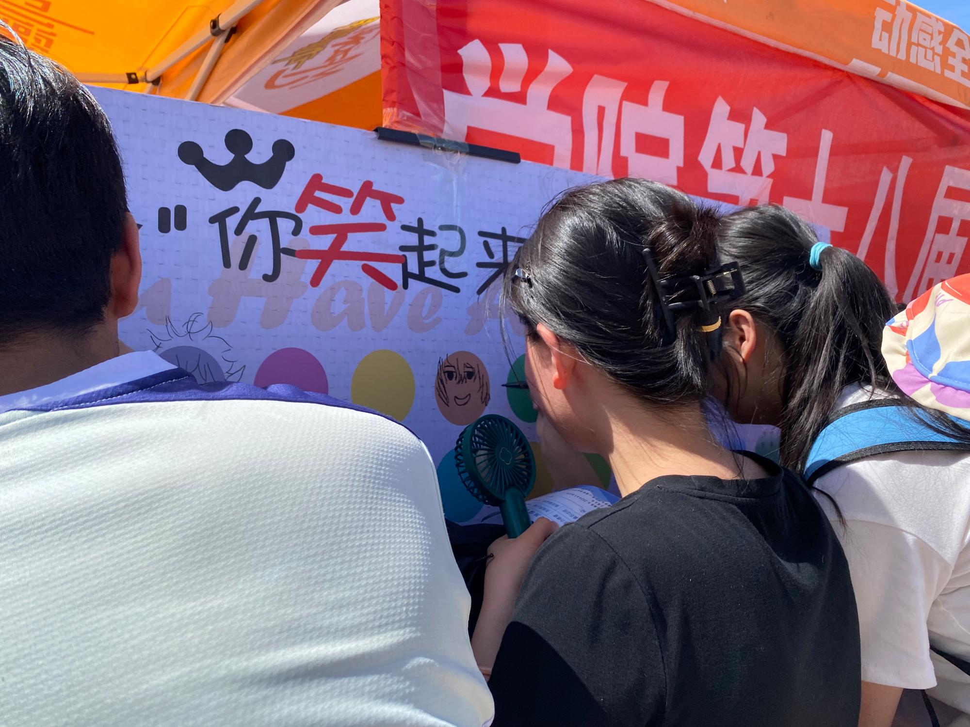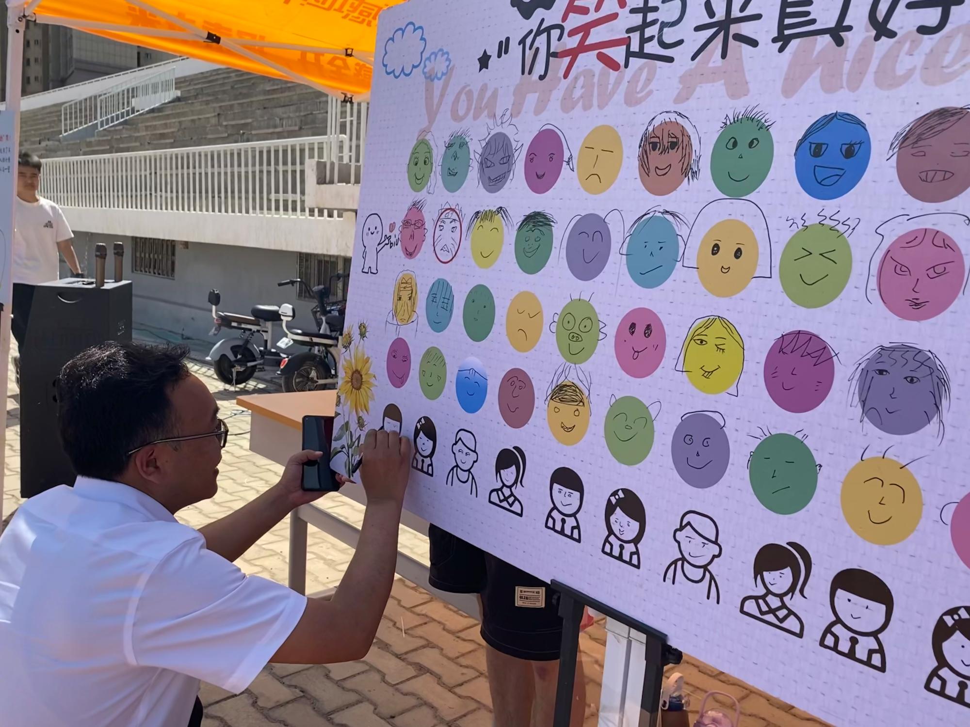 活动现场,工作人员设立展板,邀请参加游园会的师生在展板上画出自己的笑脸。师生们纷纷驻足参与活动,不一会儿,展板上就画满了笑脸,每个笑脸都是独一无二的,承载着同学们的创意和爱意。