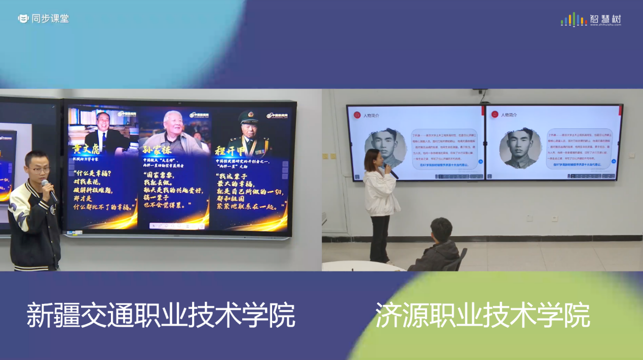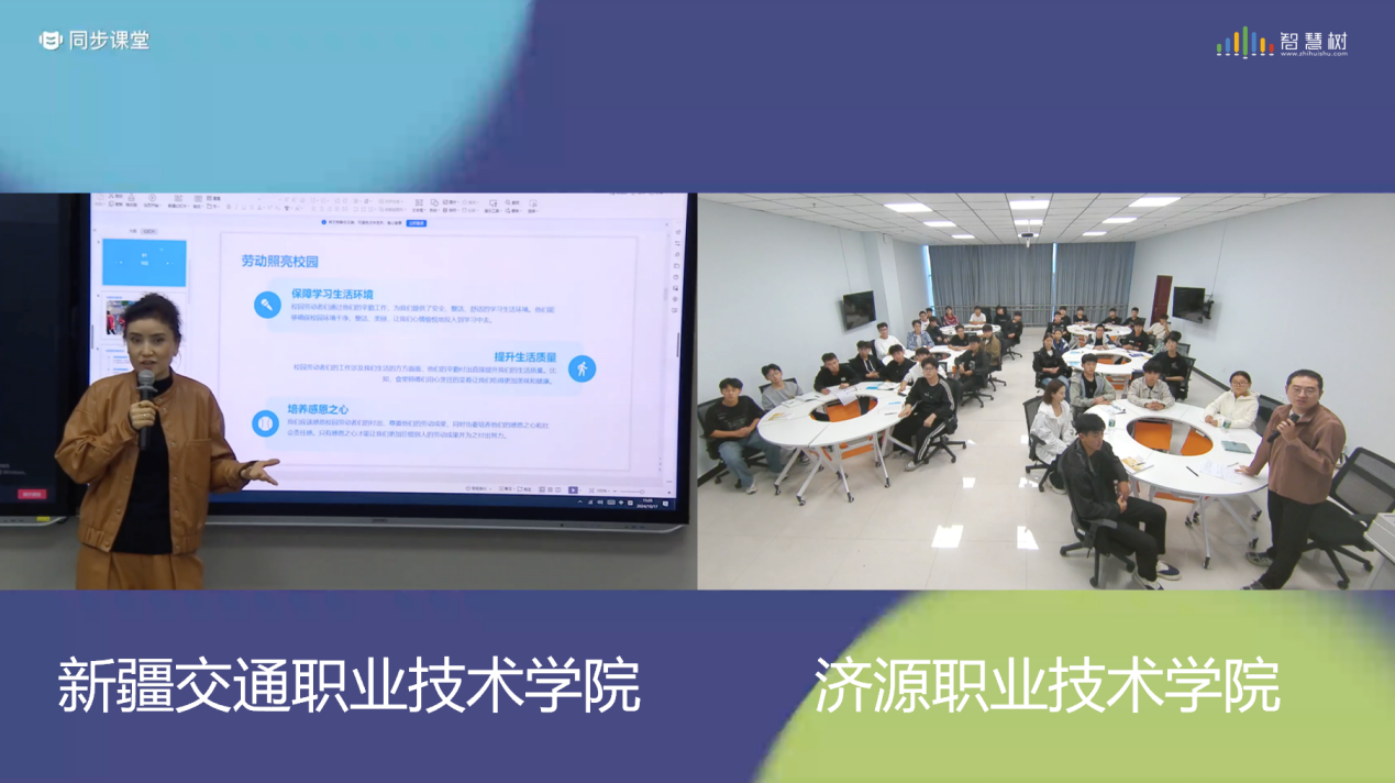 新疆交通职业技术学院扎依达·夏依马尔旦老师与济源职业技术学院王国栋老师带领学生汇聚一堂,共同聆听劳动者的故事,感受劳动的价值与意义。来自不同地区、不同背景的同学们积极分享着自己身边最美劳动者的事迹。