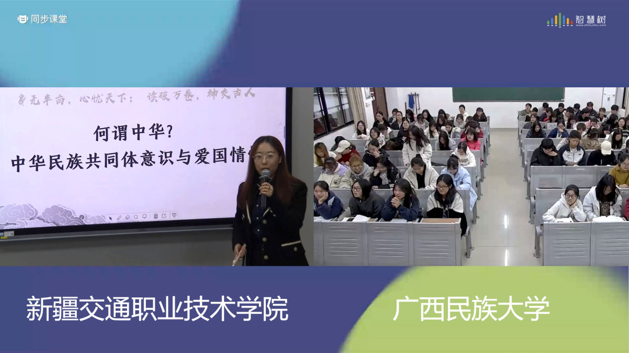 广西民族大学李大庆老师以“构建人类命运共同体的中国实践之‘一带一路’”为主题,采用学生小组汇报的形式,深入剖析了“一带一路”的历史渊源、时代价值与辉煌成就。在随后的抢答环节中,两校学生积极参与,竞争激烈。新疆交通职业技术学院吴冰寒老师则以“爱国”为脉络,讲述了左宗棠收复新疆的英勇事迹,其年少立志、捍卫国家领土的坚定信念深深打动了在场同学。课程在两校学生激昂的《我和我的祖国》歌声中落下帷幕,歌声中饱含着同学们对祖国的深厚情谊。