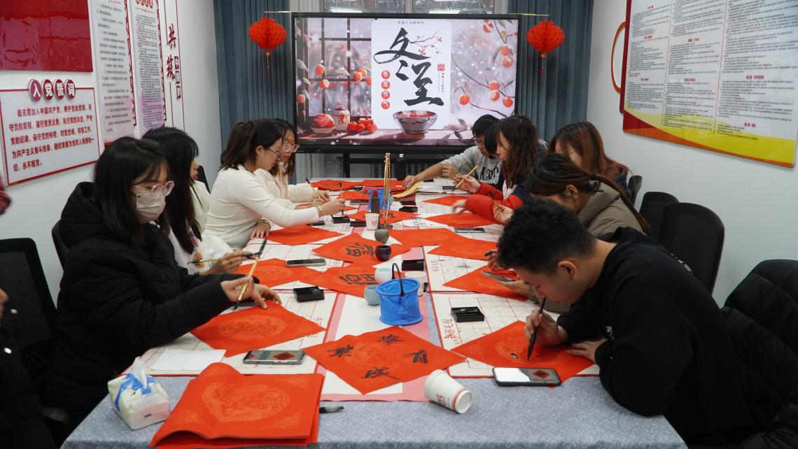 活动开始,赵晓雪老师为大家讲解冬至的来历与文化内涵,“冬至如大年,人间小团圆”这句俗语也体现出人们对冬至的重视。随后,同学们在老师的指导下学习如何让执笔,将新春祝福融入笔端,专注于福字书写。红红的福字,承载着大家对美好生活的期许,象征着新年福气满满。
