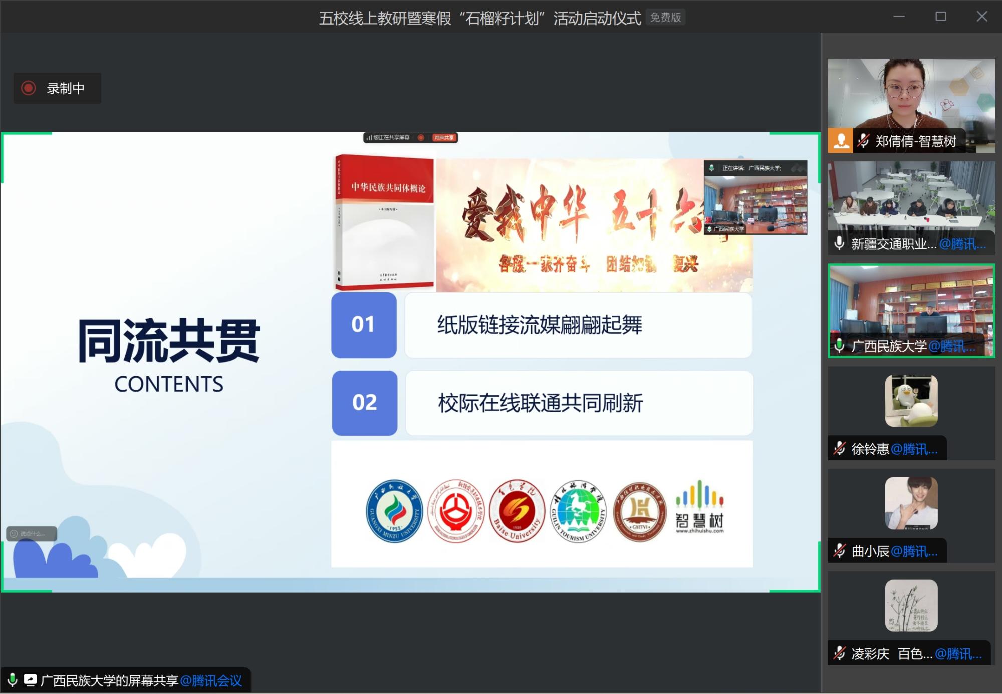 1月6日,新疆交通职业技术学院与广西民族大学,百色学院、桂林旅游学院、广西经贸职业技术学院五所学校在智慧树平台的支持下相聚云端,开展了《中华民族共同体概论》课程五校线上教研暨寒假“石榴籽计划”活动启动仪式。