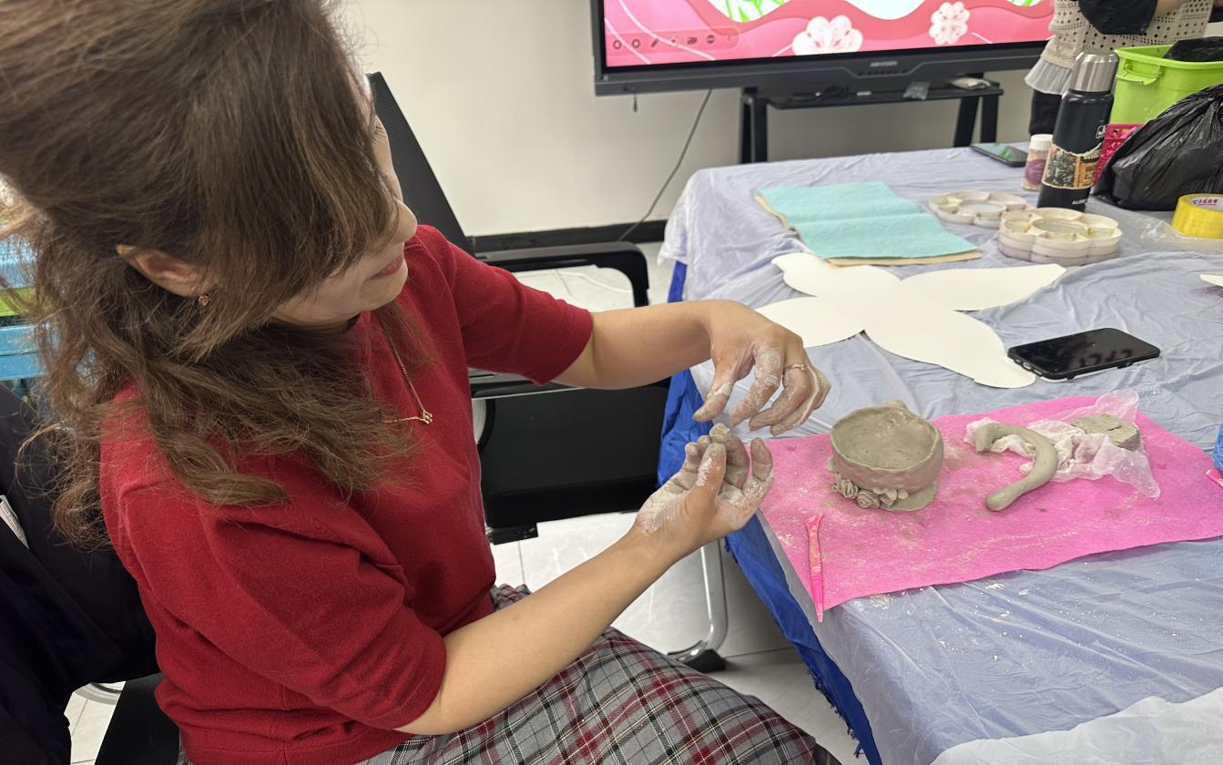 在陶艺制作环节,教师们纷纷化身“陶艺大师”,全神贯注地投入到陶艺创作中。揉泥、拉坯、修坯、装饰……大家在陈老师的指导下,一步步将手中的泥土塑造成形态各异的作品。