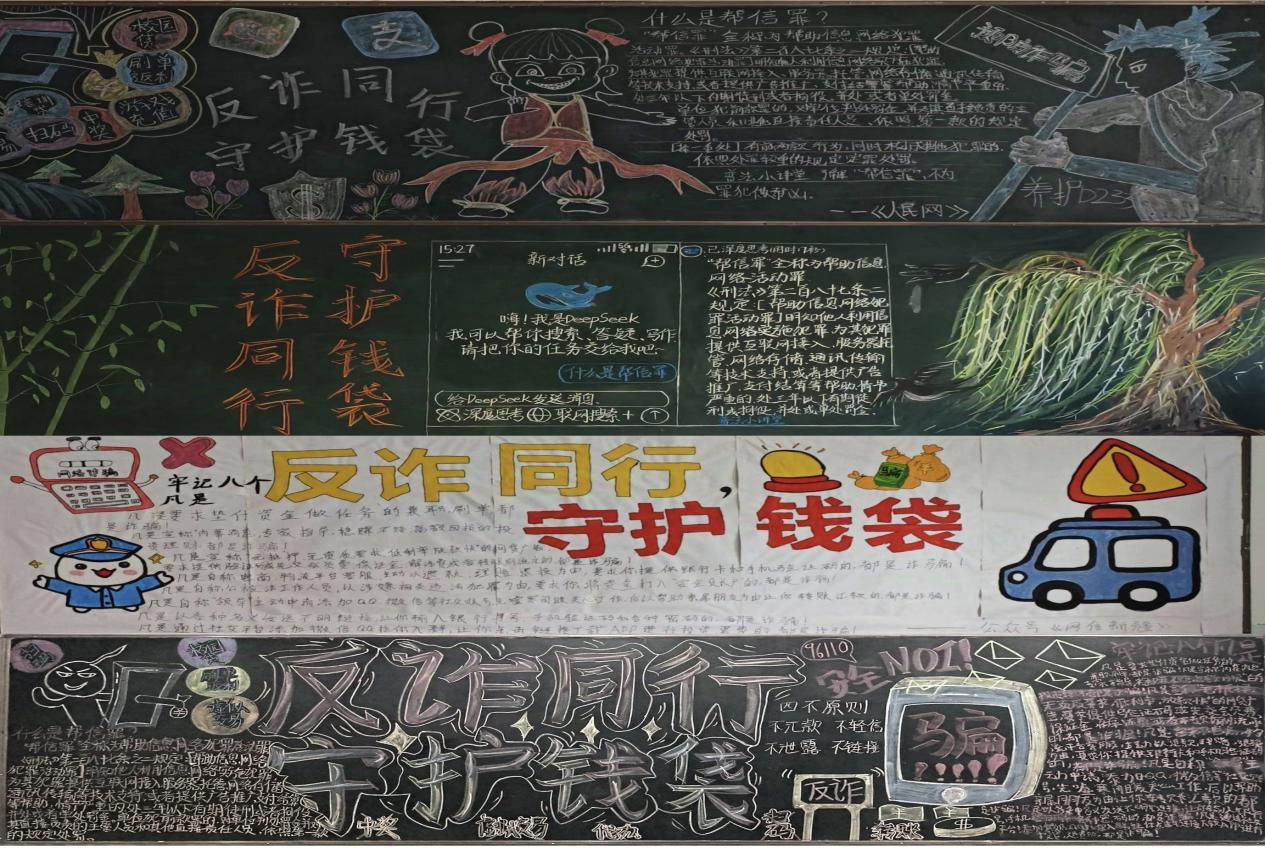 活动期间,各班紧紧围绕“帮信罪”“两卡犯罪”“反诈八个凡是”等关键反诈知识展开创作。通过清晰的案例图解、精准的法律条文解读,生动地揭示了“帮助信息网络犯罪活动罪”的构成要件与严重法律后果;详细剖析“两卡”(手机卡、银行卡)犯罪的惯用手段和危害,让同学们深刻认识到此类犯罪的隐蔽性和危害性;巧妙结合“八个凡是”反诈口诀,如“凡是要求垫付资金做任务的兼职刷单,都是诈骗!”,设计出醒目的警示标语,直抵人心,强化学生的防范意识。部分班级还别出心裁地增设“普法讲堂”专栏,以直观的流程图解诈骗套路,帮助同学们快速识别诈骗陷阱,极大提升了学生们的反诈识别能力。