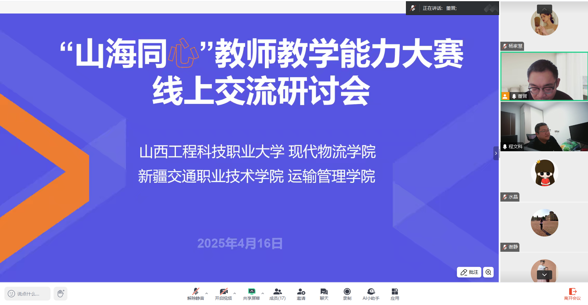 4月16日下午,运输管理学院与山西工程科技职业大学现代物流学院联合举办“千里云教研 山海共成长”教师教学能力大赛线上交流研讨会。会议采用云端线下联动形式,山西工程科技职业大学现代物流学院多位骨干教师、道路桥梁工程学院侯培培老师等共同参与,围绕教师教学能力大赛备赛经验展开专题分享与交流。