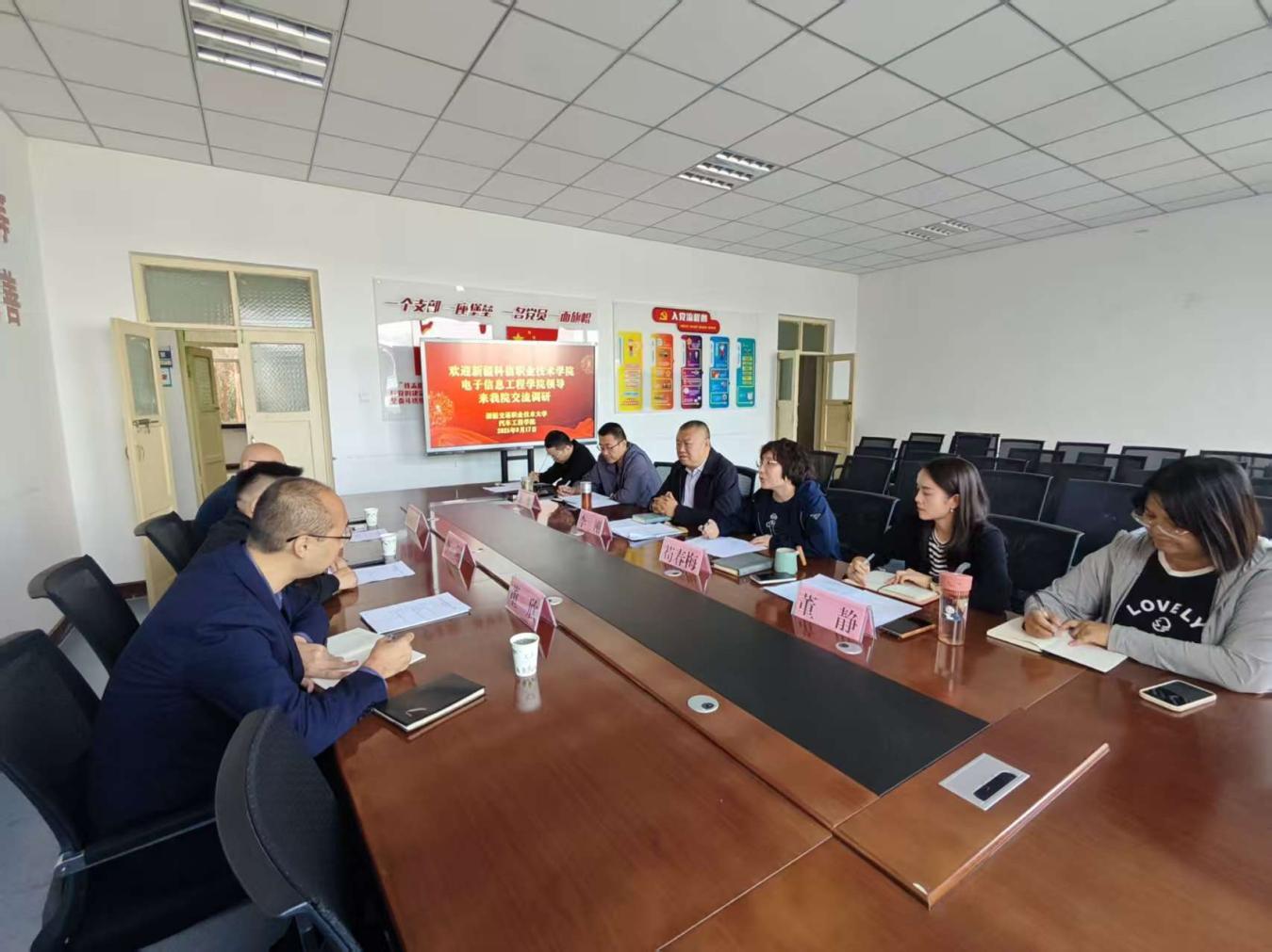 会上,李刚首先对新疆科信职业技术学院电子信息工程学院一行的到来表示热烈欢迎。随后苟春梅对学校及汽车工程学院现有专业、实训基地、创新工作室、师生荣誉、校企合作项目、校外实习合作基地建设情况进行了详细介绍。寇星源介绍了新能源汽车检测与维修技术专业培养方案、校企合作做法和经验。随后,双方就学科建设、专业建设、人才培养模式、科研合作等方面进行了深入探讨和交流。