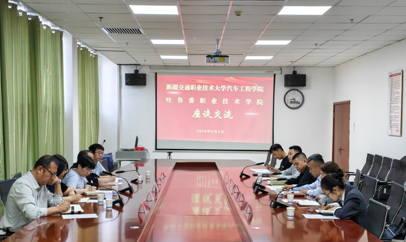 随后,调研团队前往吐鲁番职业技术学院,与该校相关领导及汽车专业骨干教师开展座谈交流。双方聚焦汽车类专业课程体系构建、实训基地建设、职业技能人才培养模式、产教融合实施路径等重点内容交流经验