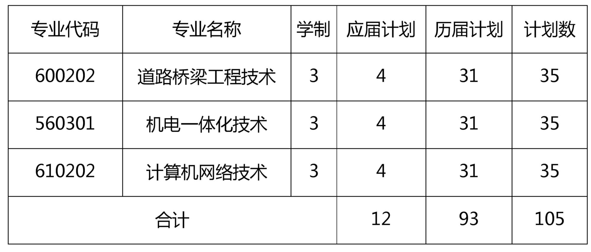 2020年高职扩招的总计划为105人,专业计划如下表: