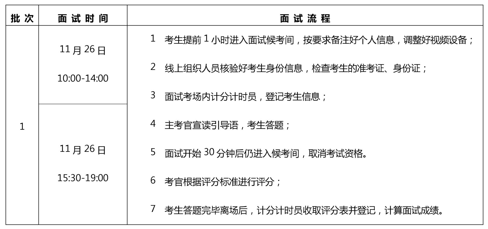 考官根据考生综合表现情况,对照各项评分标准进行评分。每名考生面试时间3分钟。