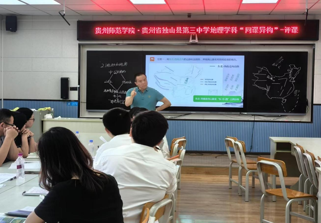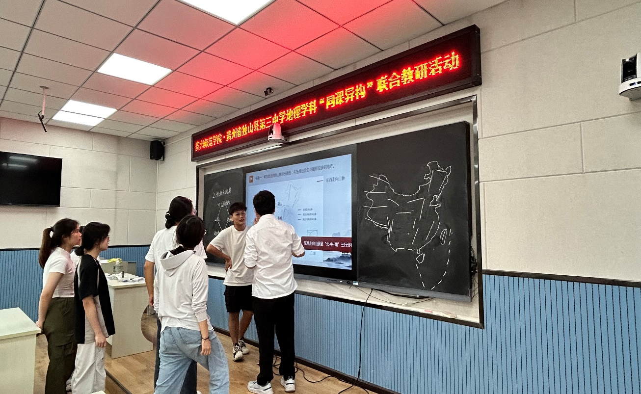 实践活动以“提升优师生教学技能与实践能力”为中心,分为地理师范生教育见习研习、实习试讲两个环节。首先,见习研习实践活动赴贵州省黔南州龙里县民族完全中学、黔南州惠水县第四中学、贵州省独山高级中学观摩三位2021级实习生授课,课后开展评课与教学经验分享探讨会,三位实习生在会上分别分享了他们的课程设计思路,随后优师计划生表达对课堂的感想与评价,最后由几位带队老师就地理师范生技能培养、中学地理授课模式与教学方法等进行点评。会上,郑建教授多次提到:“地理教师在地理课堂教学中应该加强教学活动的设计感、层次感,让学生有更多的获得感、自豪感与享受感,强化育人过程,重视对学生的人格培养。” 其次,实习试讲活动在第二天下午由一名优师计划学生与独山三中两名教师进行了“同课异构”教学活动。优师计划学生与带队老师们进行观摩。在活动结束后优师计划学生与三中教师进行交流与学习。随后开展了评课会议,由郑建教授对三节课进行了总结与评价。