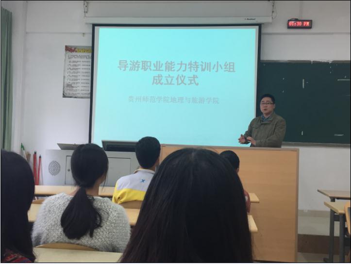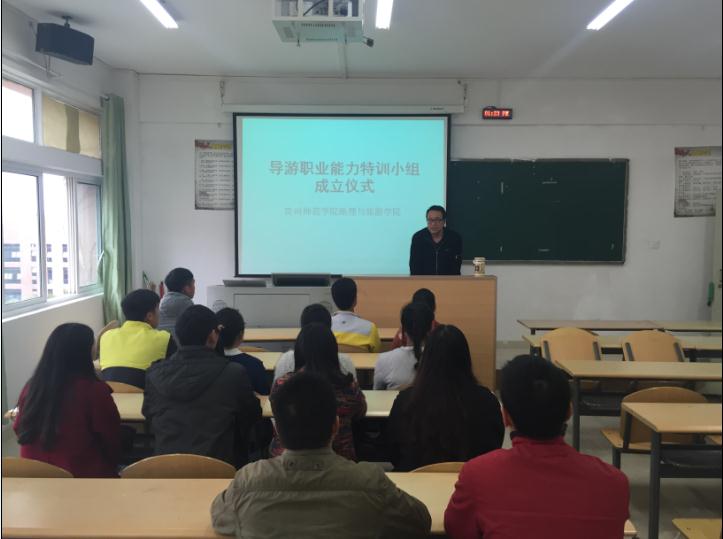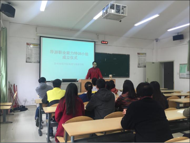 2015年11月25日下午1点30分,经过近两个月的前期运作,贝博官网首期导游职业能力特训小组正式宣布成立。成立仪式由项目发起人周杰副教授主持,院党委副书记吴亚平以及分管教学的副院长罗绪强同志出席仪式并致辞。吴亚平与罗绪强对导游职业能力特训小组的组建给予了高度肯定,对符合应用型人才培养理念的旅游本科职业教育创新行为表示大力支持。
