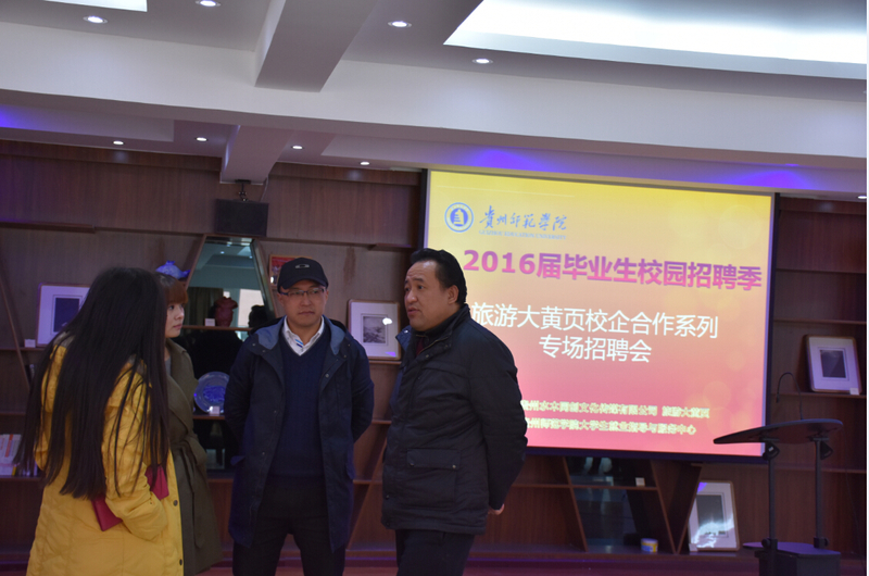 2015年12月18日中午12点至下午14点,由贝博官网旅游管理专业实践基地贵州水木同创文化传媒有限公司与校招就处共同主办、地理与旅游学院协办的旅游相关专业专场招聘会在贝博官网大学生就业与服务中心成功举办。贵州水木同创文化传媒有限公司副总杨巍与“旅游大黄页”项目总监王再利全程为参会企业服务,充分展现了“旅游大黄页”同业服务平台的核心服务理念和创新服务方式。地理与旅游学院党委副书记吴亚平到会走访,并安排旅游实训室主任周杰副教授全程协助主办方开展会场服务。