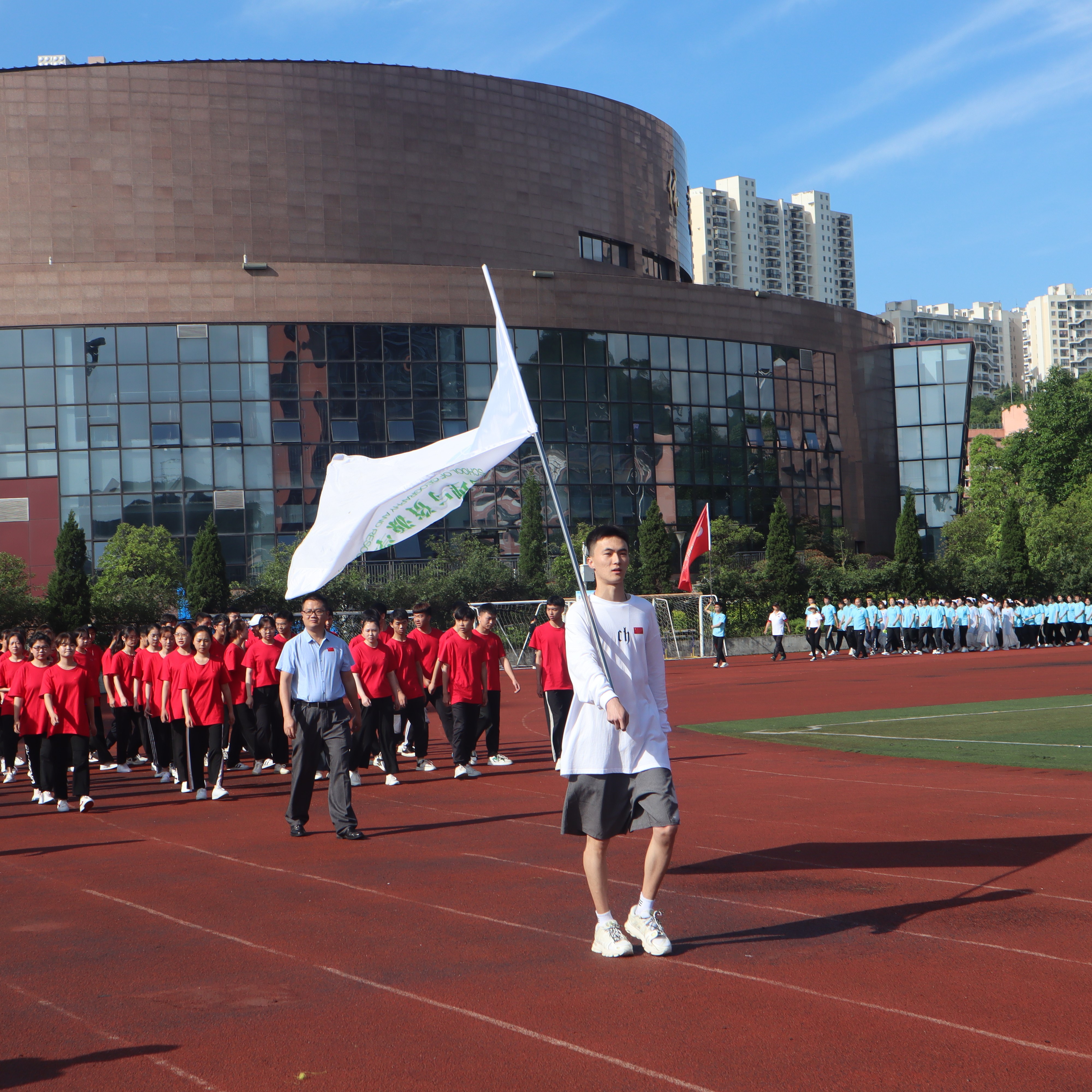 2021年5月13日上午8:30,ballBET贝博BB艾弗森第八届体育节开幕式在田径场上拉开序幕。出席本次开幕式的有校长韦维及全体校领导,各二级学院领导和老师代表,参加本次开幕式的还有各学院学生表演方阵和观摩团队。