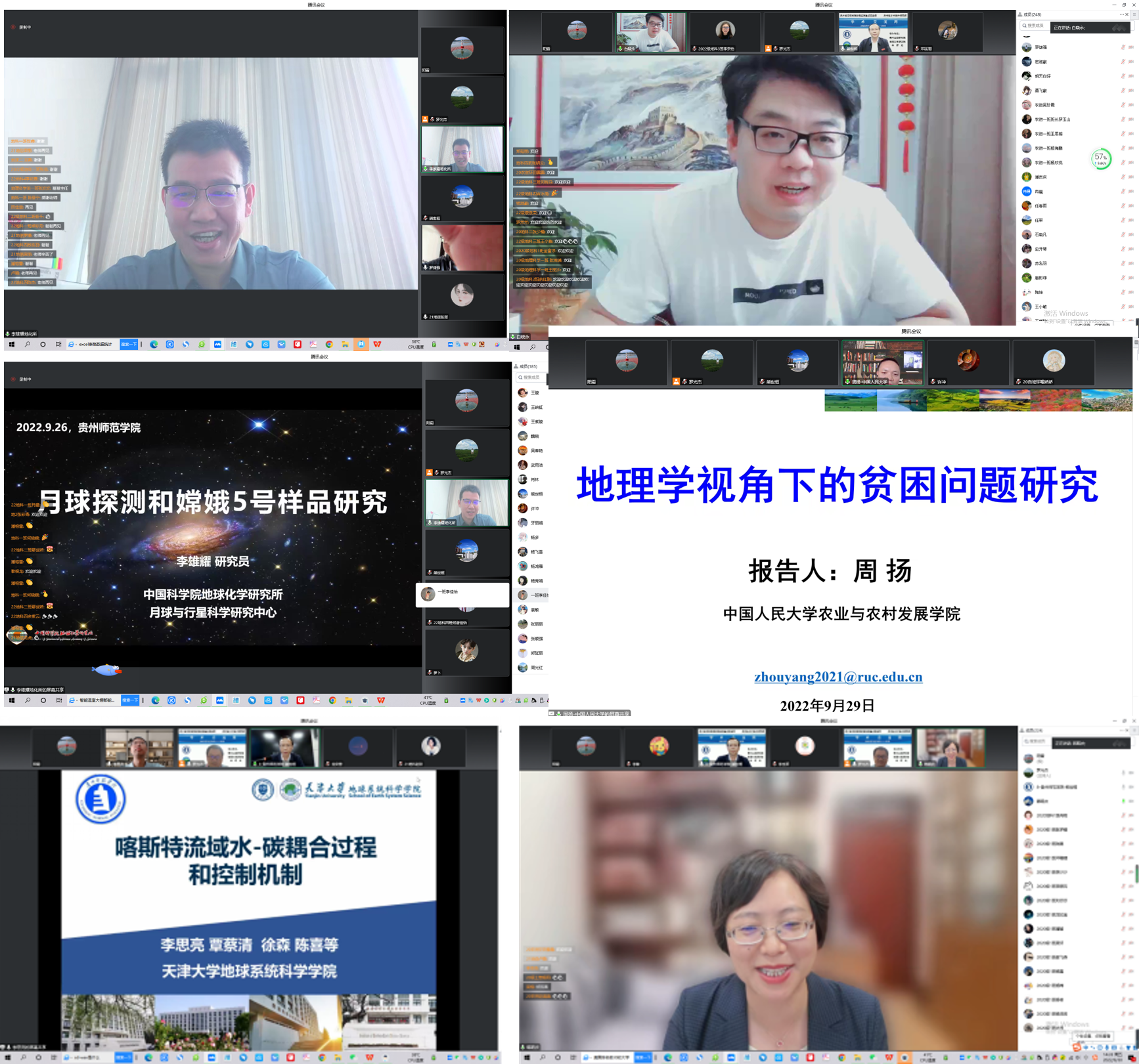 本次交流周共邀请来自中国科学院、复旦大学、中国人民大学等科研院所和高校专家学者进行了6场专题学术报告。中国科学院地球化学研究所研究员,博士研究生导师,月球与行星科学研究中心主任李雄耀作了题为《月球探测和嫦娥五号样品研究》的专题报告;中国科学院地球化学研究所研究员,博士研究生导师,生态环境与资源利用中心主任白晓永作了题为《喀斯特生态安全与贵州碳中和能力诊断》的专题报告;美国NASA研究科学家,贝博官网特聘教授李爽作了题为《地球科学大数据高性能计算的现状与展望》的专题报告;中国人民大学副教授,博士生导师周扬作了题为《地理学视角下的贫困问题研究》的专题报告;国家杰出青年科学基金和优秀青年科学基金项目获得者,天津大学教授,博士研究生导师李思亮作了题为《喀斯特流域水-碳耦合过程和控制机制》的专题报告;复旦大学历史地理研究所教授,博士研究生导师韩昭庆作了题为《历史时期玉米种植与贵州石漠化变迁的关系》的专题报告。