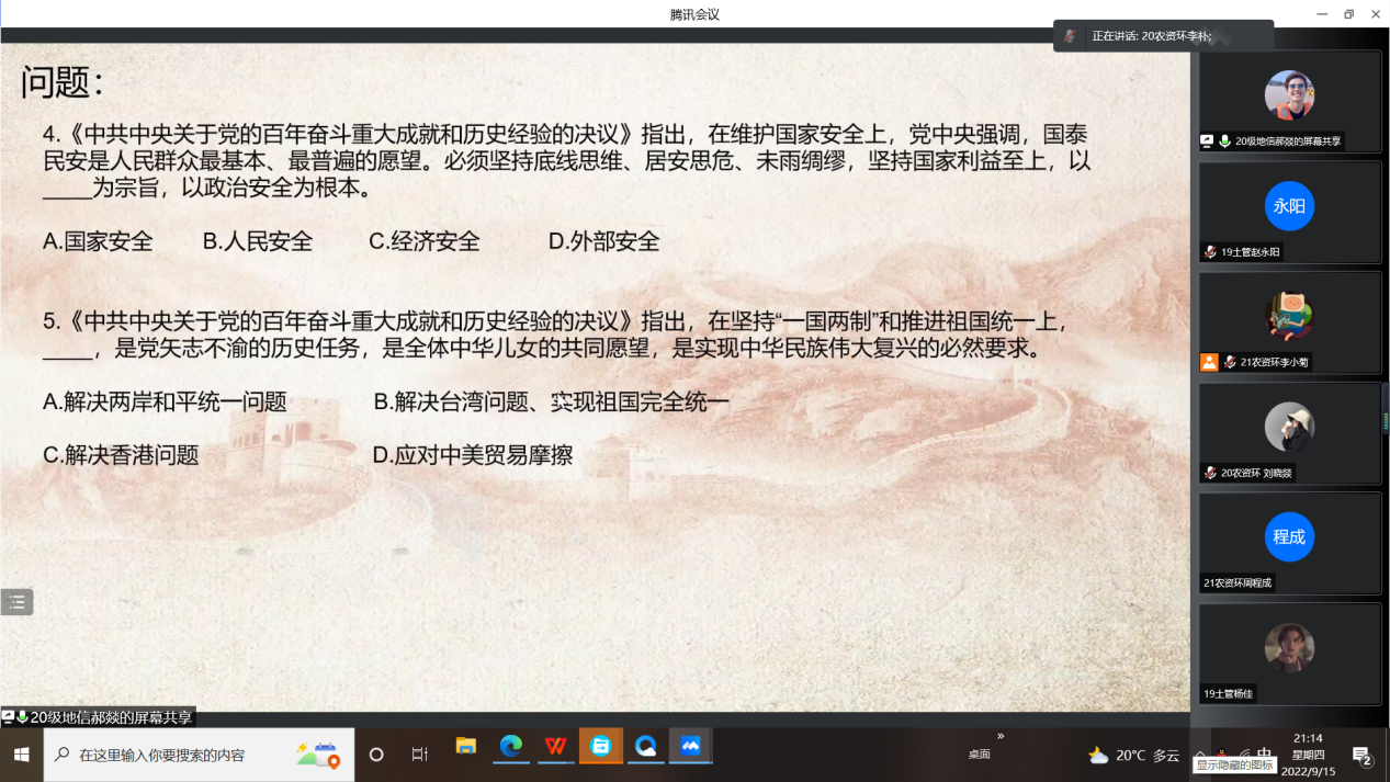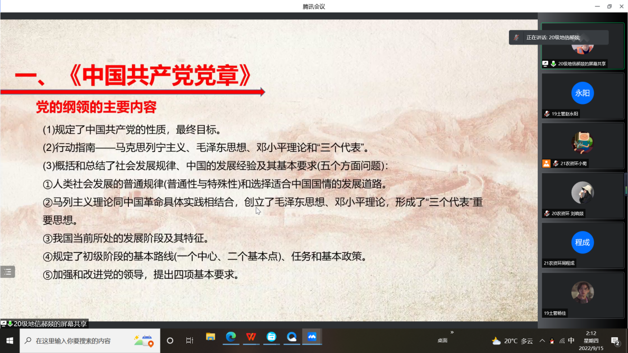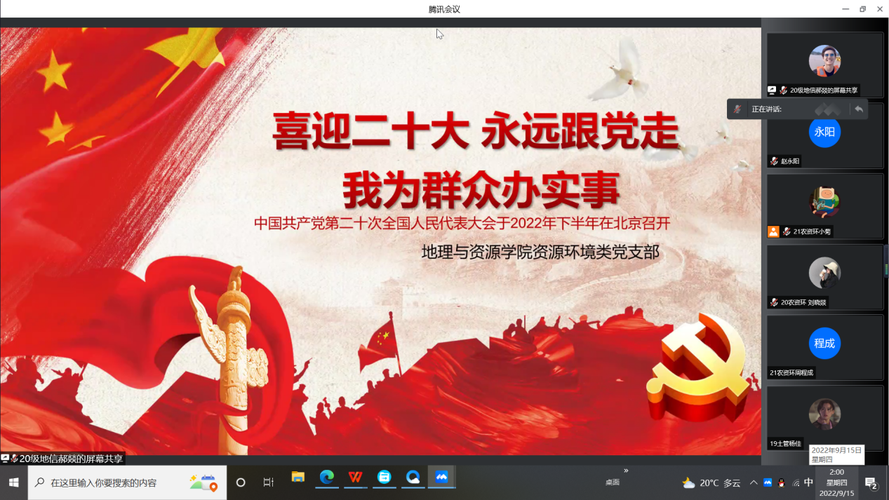 2022年是党的二十大召开之年,是奋力迈向第二个百年奋斗目标的关键之年。以更加坚定的理想信仰、更为崇高的使命追求、更具扎实的政治作风,迎接党的二十大召开是每一名共产党员的根本要求和重大课题。在这个有重大意义的时期,9月15日ballBET贝博BB艾弗森资源环境类学生党支部的同学齐聚在网络上,准时共上党日活动,主讲人郝燚为我们讲解了百年来,我们党团结带领人民群众进行大气磅礴、气吞山河的英勇斗争,凝萃了舍生忘我、大公无私、顽强拼搏、艰苦奋斗的红色精神,一起迎接党的二十大召开。