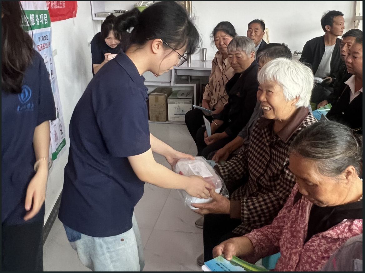 宣讲结束后,服务队成员积极协助专家组医生,组织开展义诊活动,免费向村民们测血压量血糖并提供医疗咨询,践行国家基本公共卫生服务,全面做到“医防融合,为健康保驾护航”。针对当地村民高度关注的健康问题,服务队发放了精心制作的宣传手册,包括老年人基础疾病认知、常见突发疾病及初步处理和食品安全防控等科普知识,并发放百余份家庭医疗急救包。活动尾声,服务队成员和专家组通过实地走访入户的方式,深入了解当地村民生活环境和整体卫生健康状况,向不便出行的老年人送上国家基本公共卫生服务。