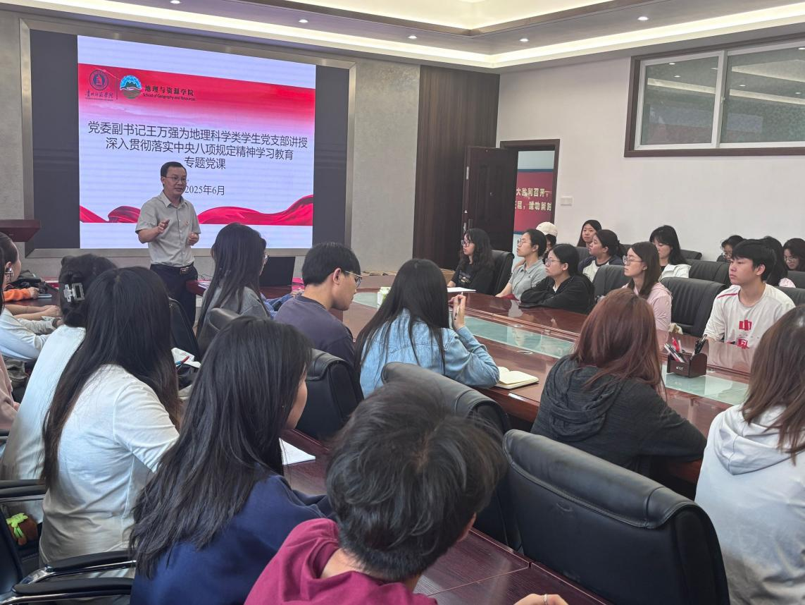 为推动深入贯彻中央八项规定精神学习教育走深走实,6月26日,ballBET贝博BB艾弗森党委副书记王万强在宁静楼323会议室,为地理科学类学生党支部全体党员讲授深入贯彻中央八项规定精神学习教育专题党课,引导支部全体党员深刻领会中央八项规定精神的丰富内涵与实践要求,强化纪律意识,筑牢思想防线。