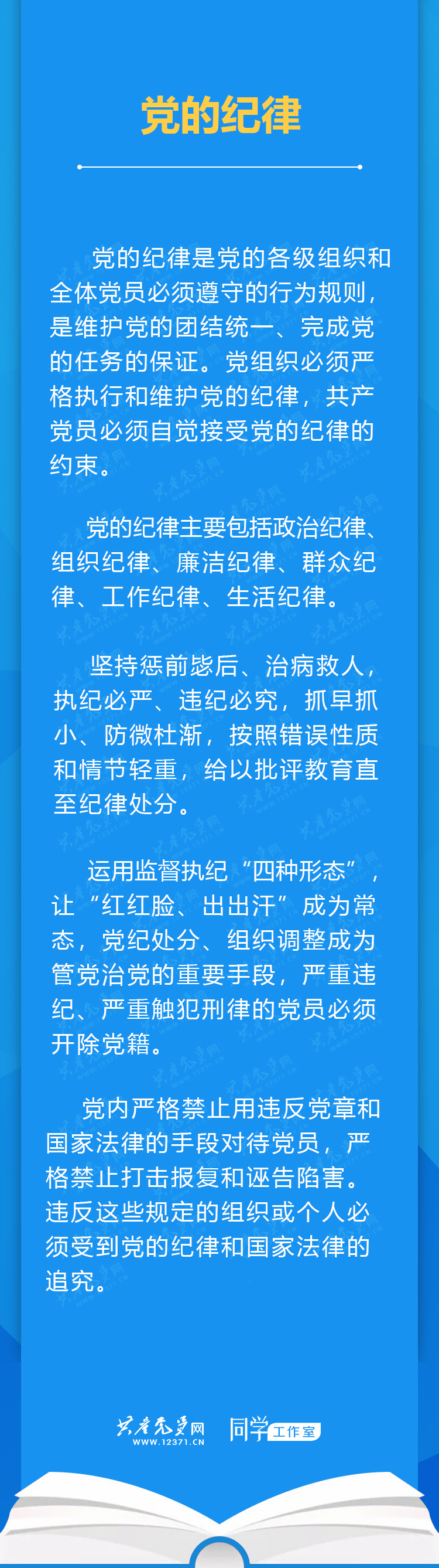 党的纪律是党的各级组织和全体党员必须遵守的行为规则,是维护党的团结统一、完成党的任务的保证。党组织必须严格执行和维护党的纪律,共产党员必须自觉接受党的纪律的约束。